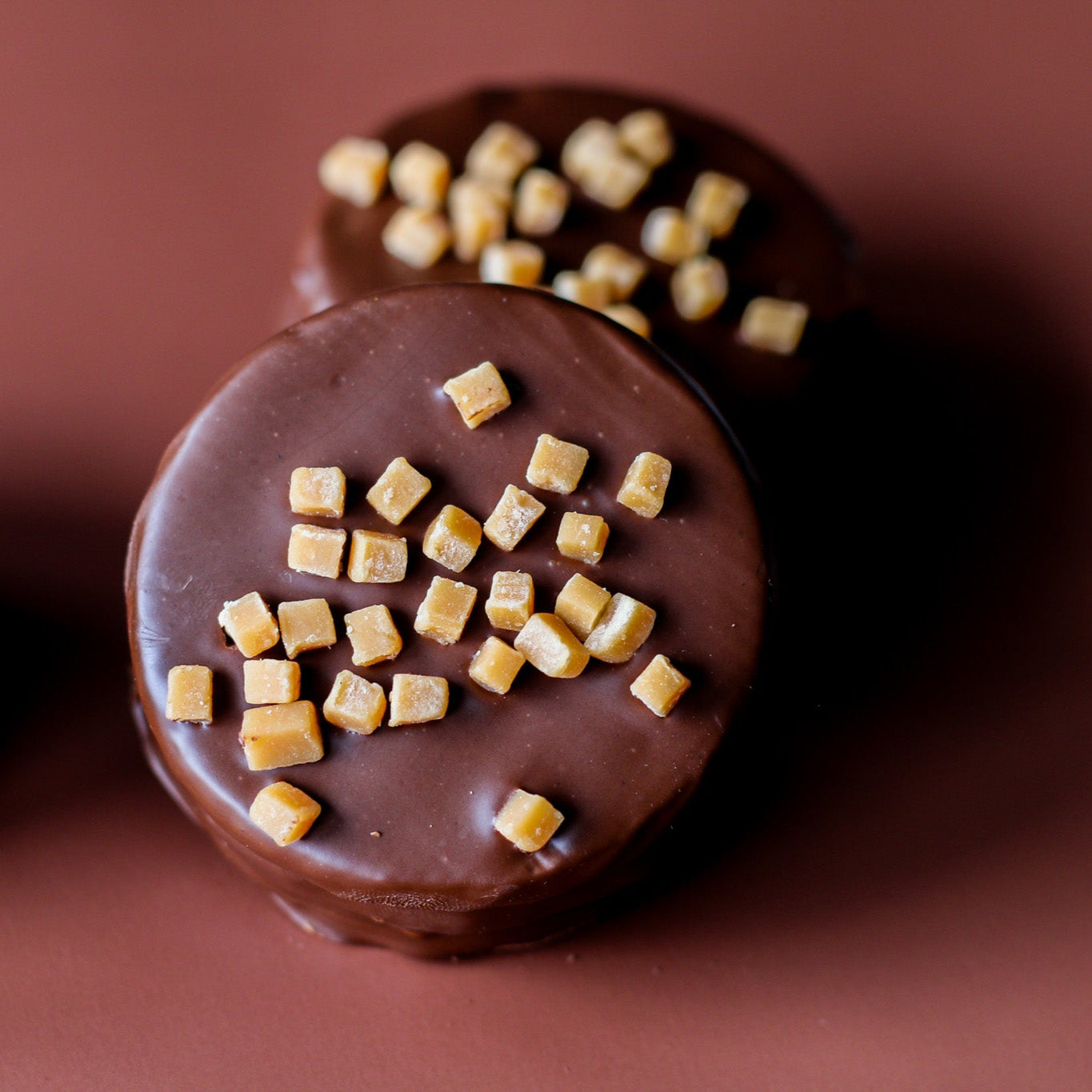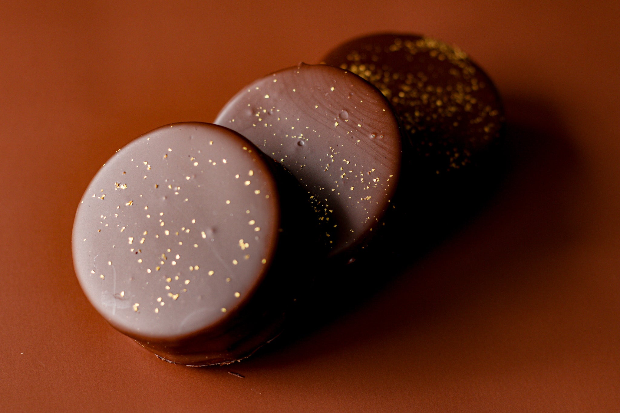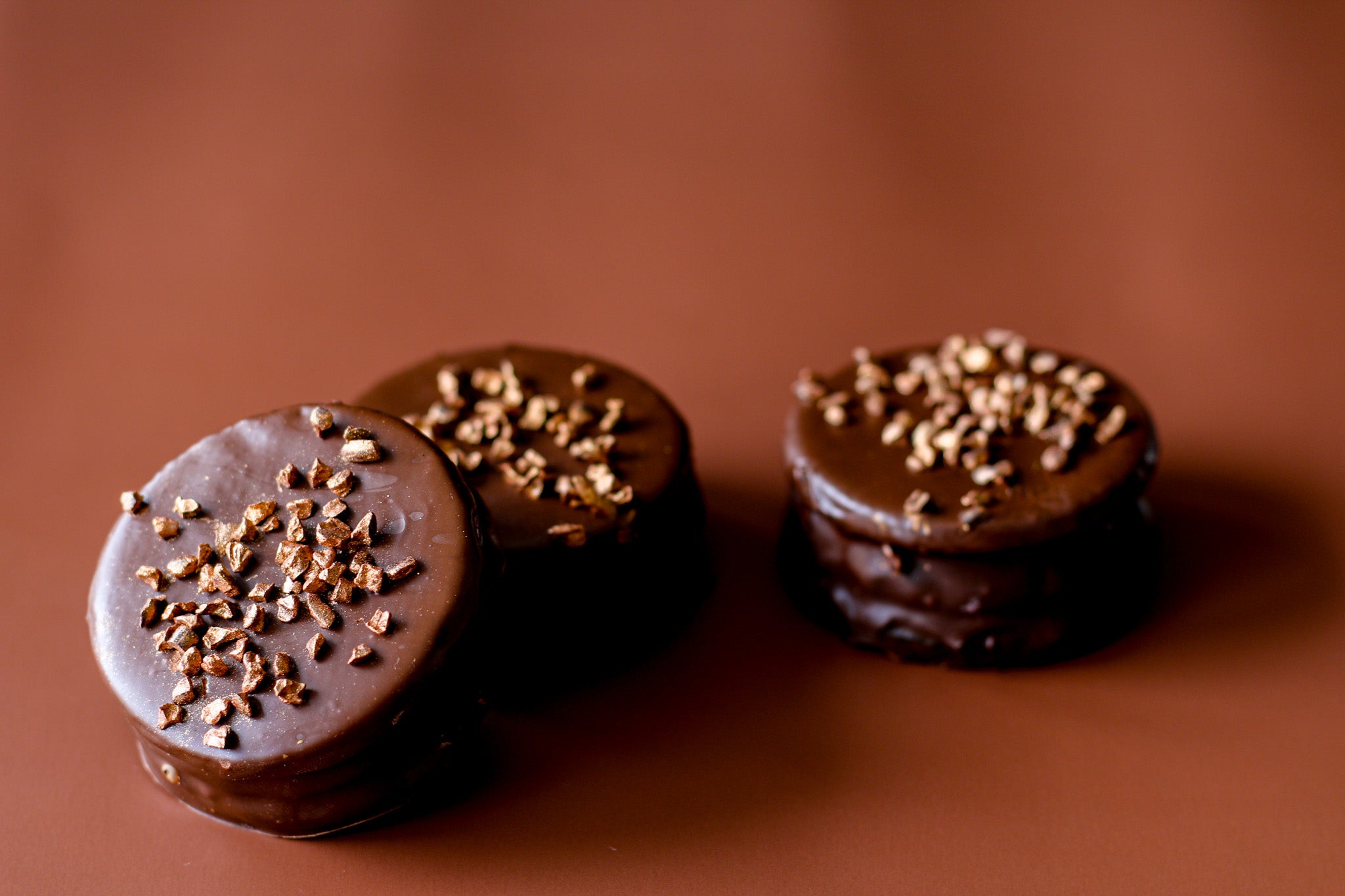 Flour, dark chocolate, butter, icing sugar, eggs, cornstarch, extra dark cacao, dark chocolate, honey, white chocolate (sugar, cocoa butter, whole milk powder, emulsifier, soy lecithin, natural vanilla flavor), baking powder, baking soda, salt, food colouring.