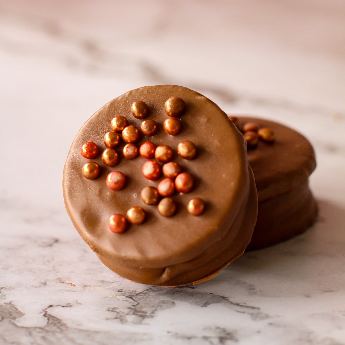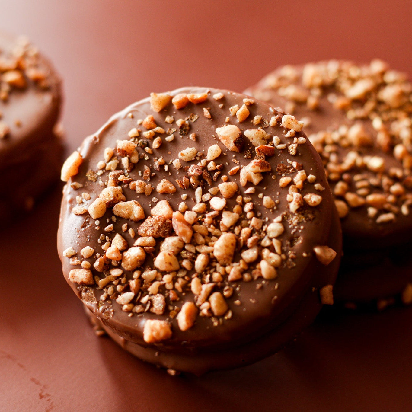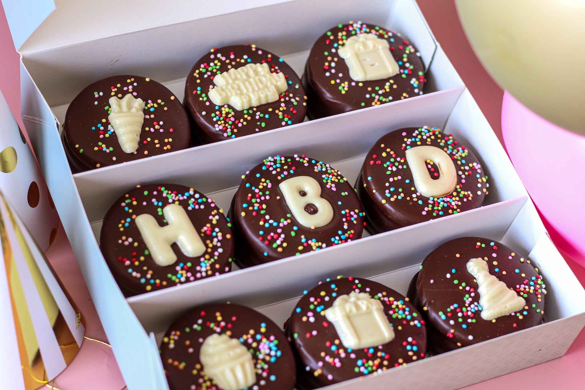 Flour, dark chocolate, butter, icing sugar, eggs, cornstarch, extra dark cacao, dark chocolate, honey, white chocolate (sugar, cocoa butter, whole milk powder, emulsifier, soy lecithin, natural vanilla flavor), baking powder, baking soda, salt, food colouring.