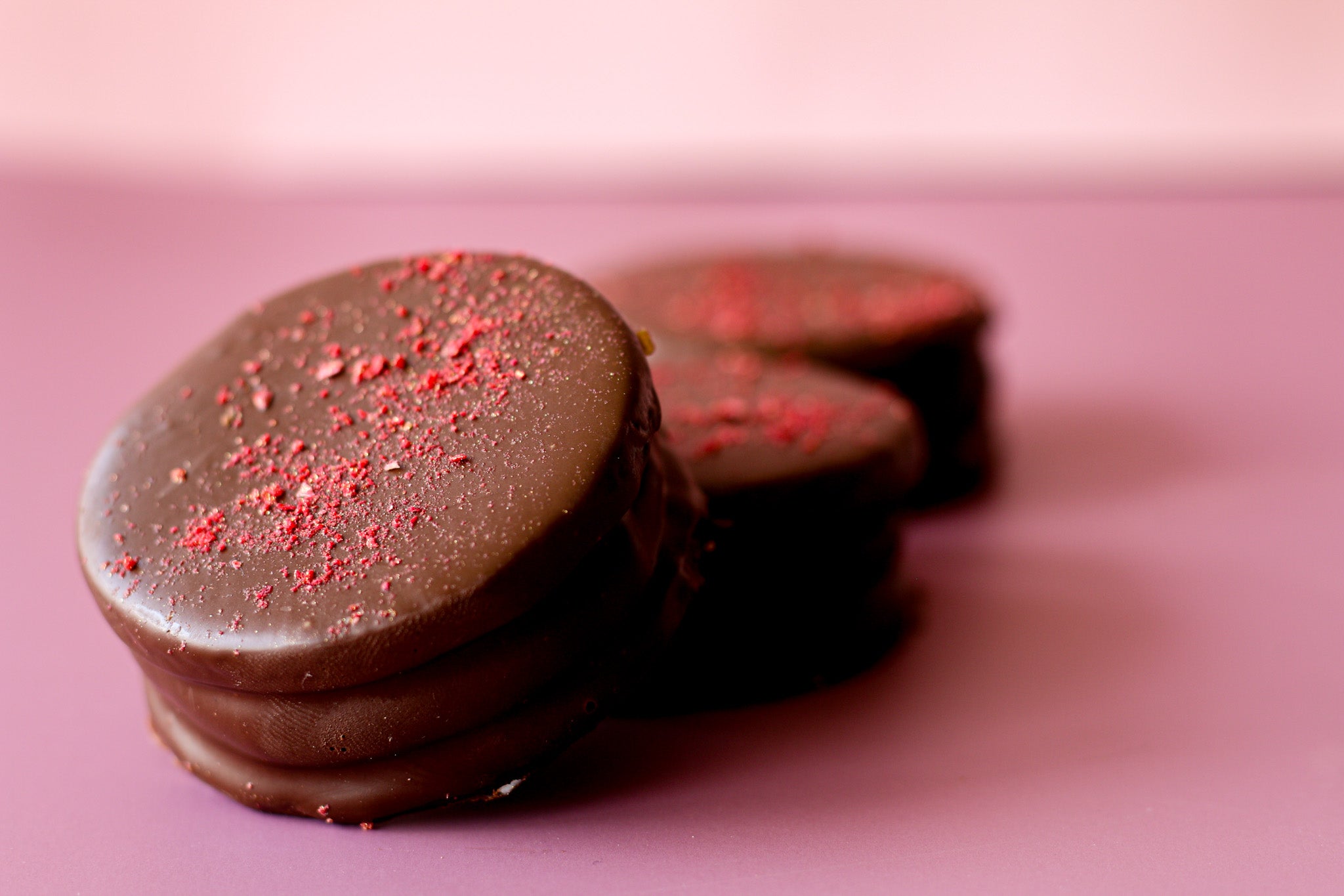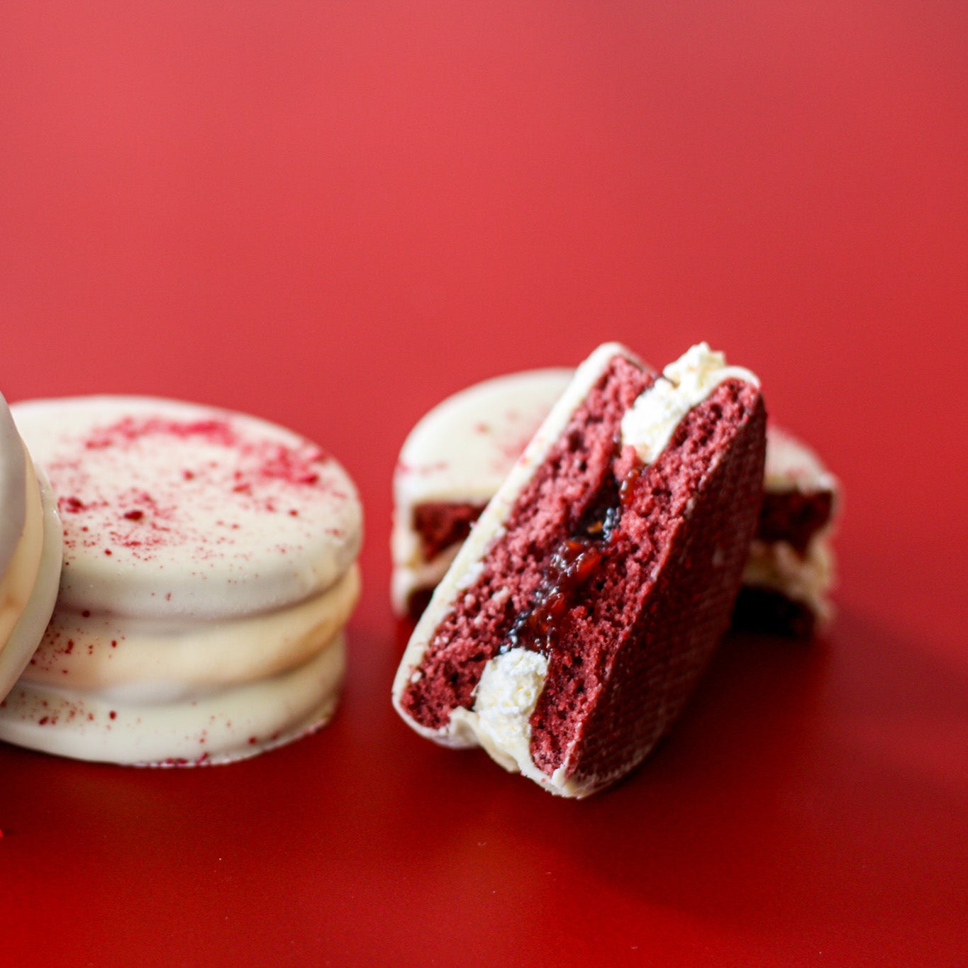 Flour, dulce de leche (full fat milk 61%, sugar, skimmed milk powder, glucose, agar-agar), dark chocolate, butter, icing sugar, eggs, cornstarch, extra dark cacao, honey, raspberries, white chocolate (sugar, cocoa butter, whole milk powder, emulsifier, soy lecithin, natural vanilla flavor), baking powder, baking soda, salt, food colouring.