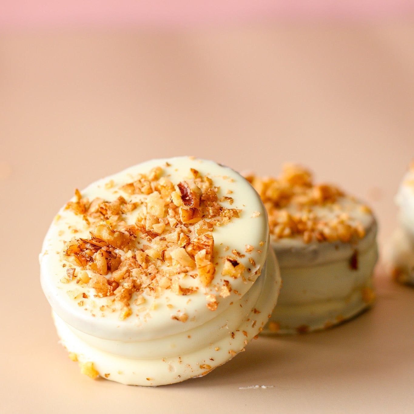Flour, dulce de leche (full fat milk 61%, sugar, skimmed milk powder, glucose, agar-agar), butter, icing sugar, eggs, walnuts, cornstarch, cacao, honey, white chocolate (sugar, cocoa butter, whole milk powder, emulsifier, soy lecithin, natural vanilla flavor), baking powder, baking soda, orange zest, salt, food colouring.