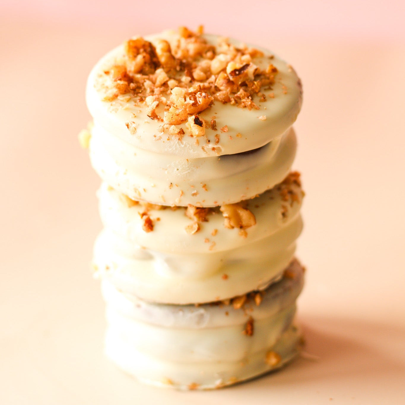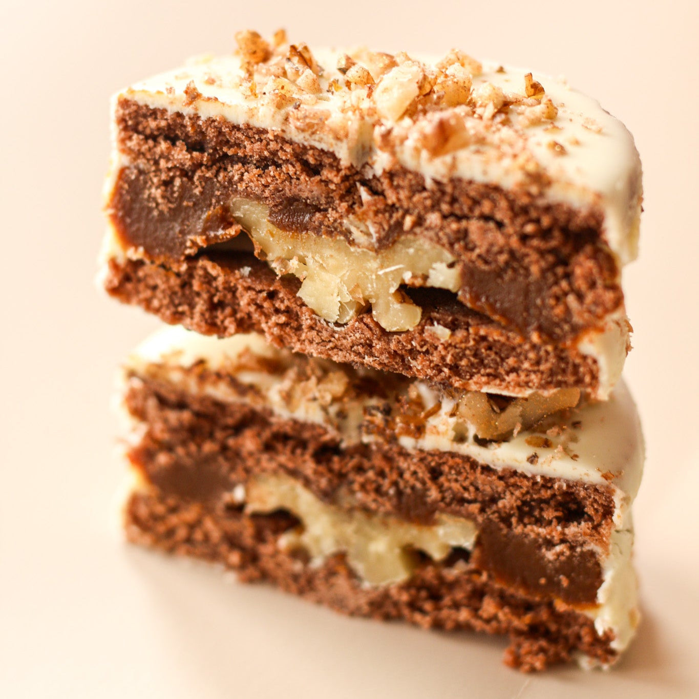 Soft, handmade cookies filled with creamy dulce de leche and crunchy walnut pieces, then coated in a smooth layer of callebaut dulce de leche.