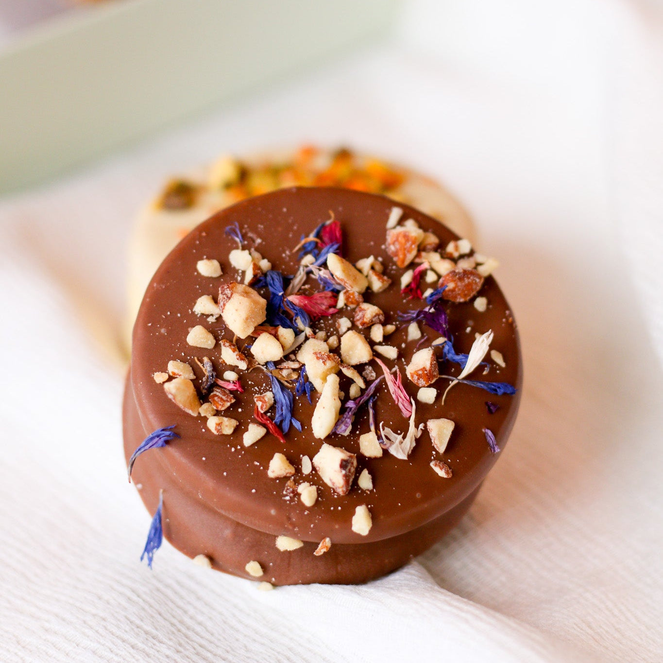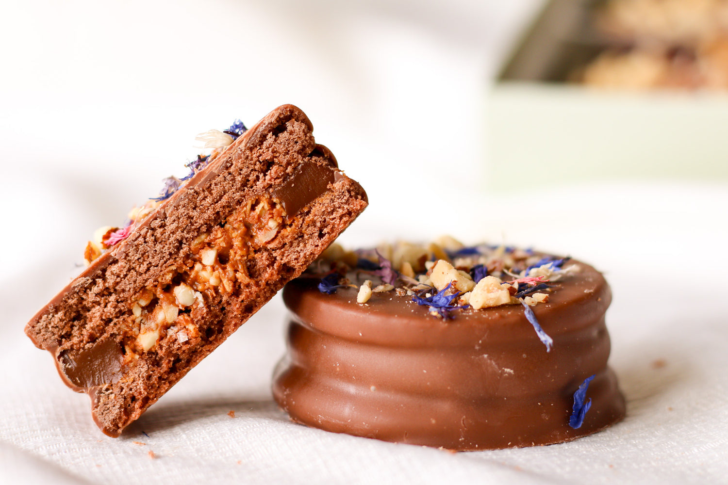 Chocolate cookies filled with rich dulce de leche and a center made of kunefe, almond praline, chopped almonds, and a pinch of Maldon salt, coated in Belgian milk chocolate.