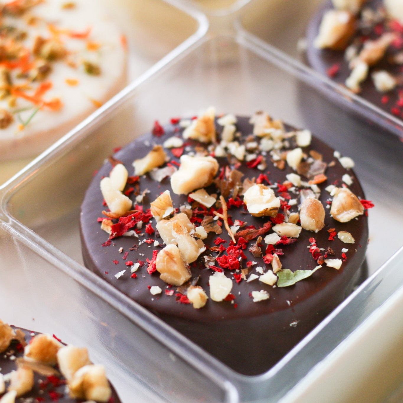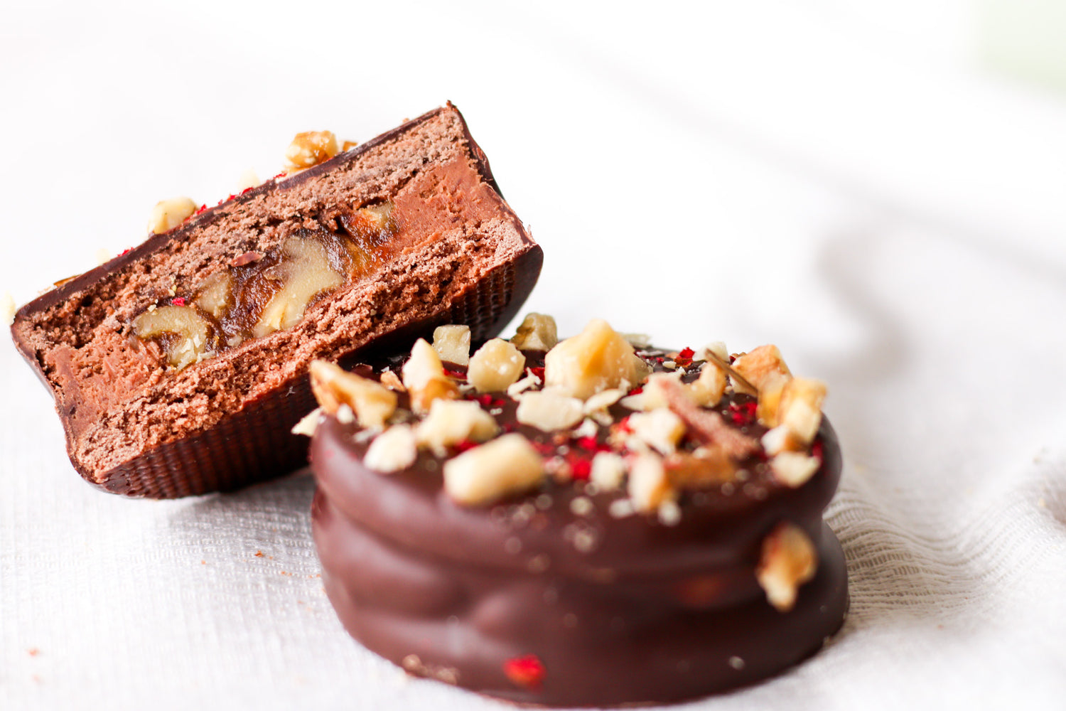 Cocoa cookies filled with chocolate mousse and a center of chopped dates and crunchy walnuts, coated in Belgian dark chocolate.