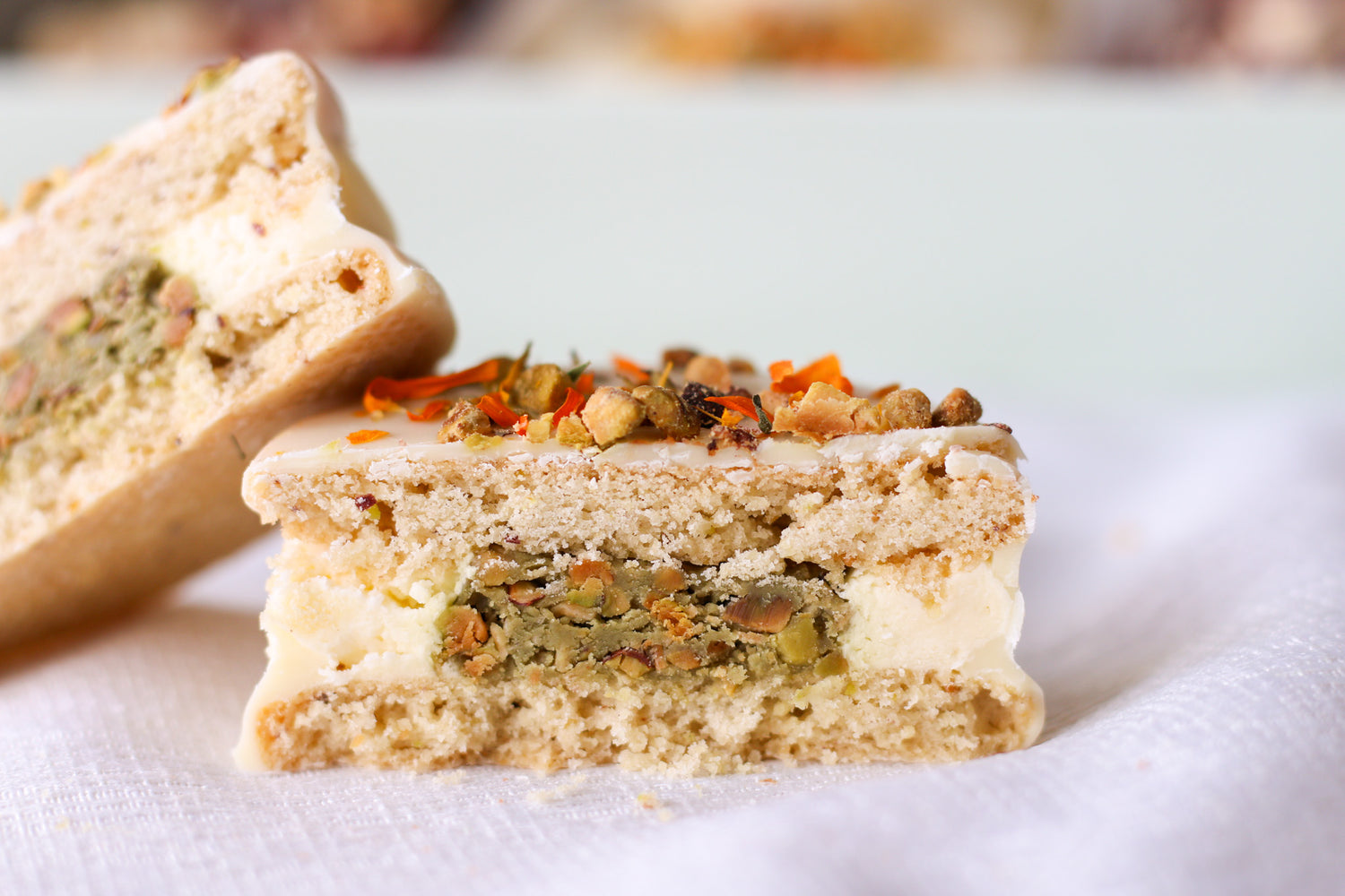 Soft pistachio cookies filled with a delicate azahar water cream, a kunefe and pistachio center, all coated in Belgian white chocolate.