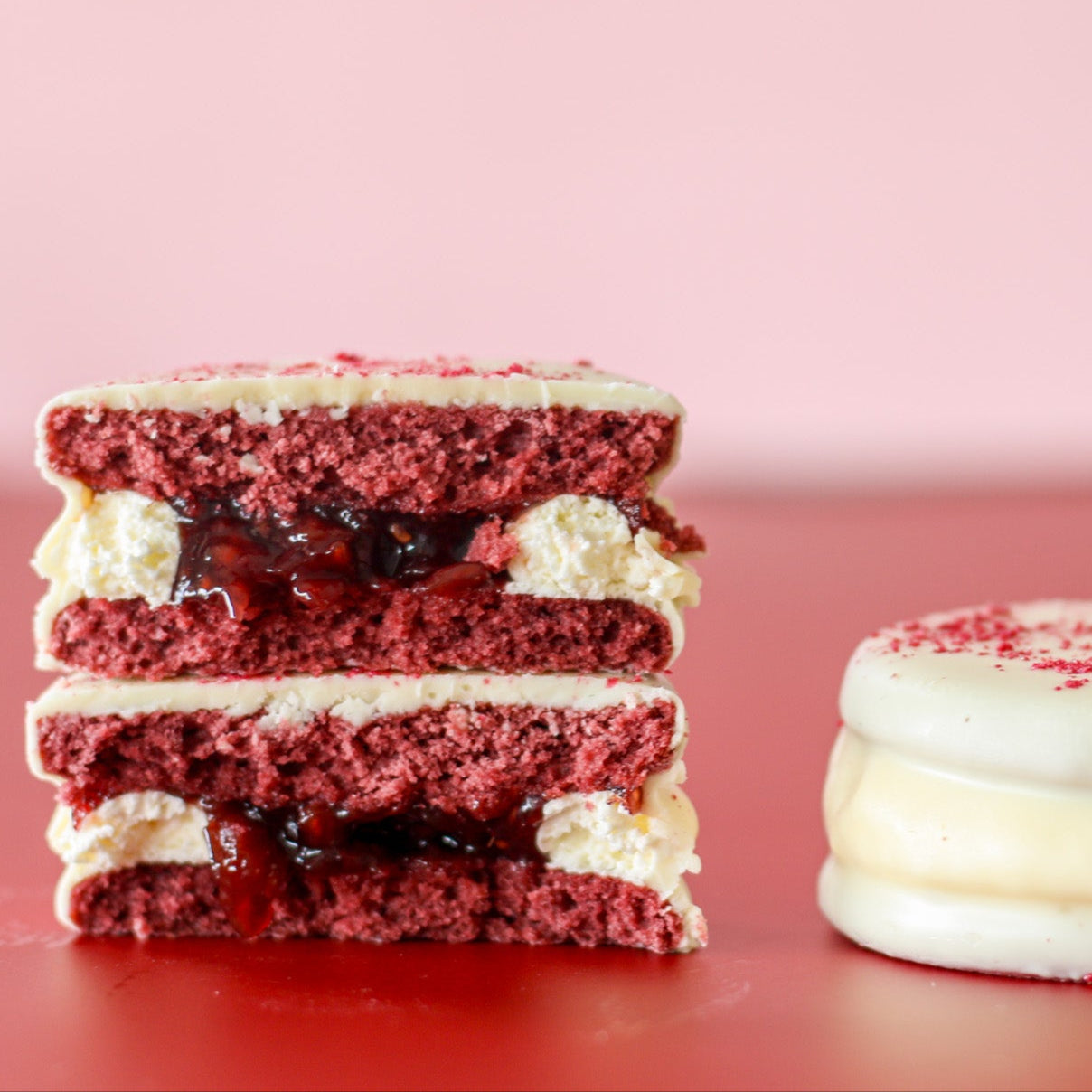 Flour, dulce de leche (full fat milk 61%, sugar, skimmed milk powder, glucose, agar-agar), dark chocolate, butter, icing sugar, eggs, cornstarch, extra dark cacao, honey, raspberries, white chocolate (sugar, cocoa butter, whole milk powder, emulsifier, soy lecithin, natural vanilla flavor), baking powder, baking soda, salt, food colouring.