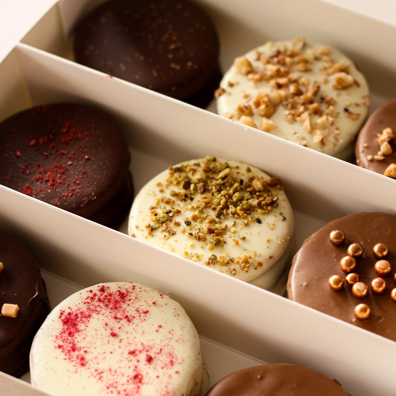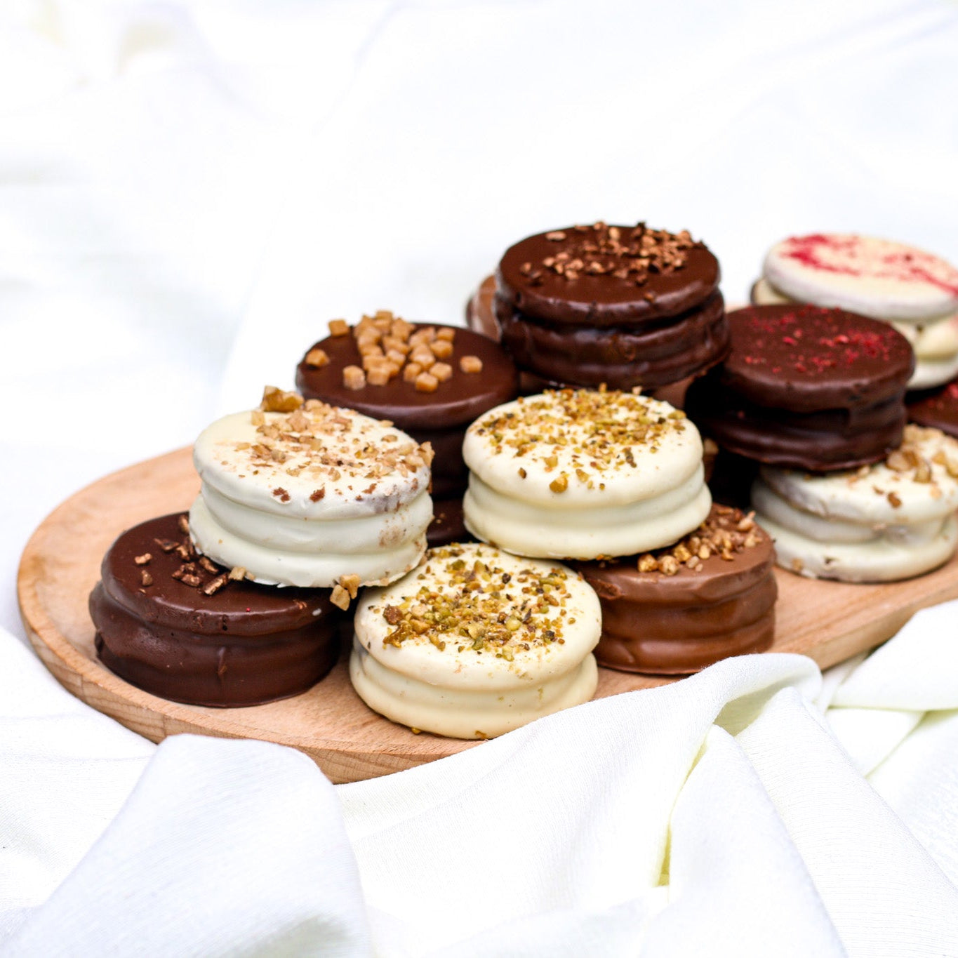 Perfect for corporate gifts, client appreciation, or office celebrations, our alfajores can be customized with your choice of filling, coating, and decoration to reflect your company’s style and needs.