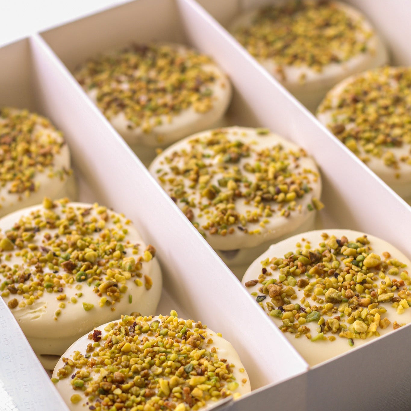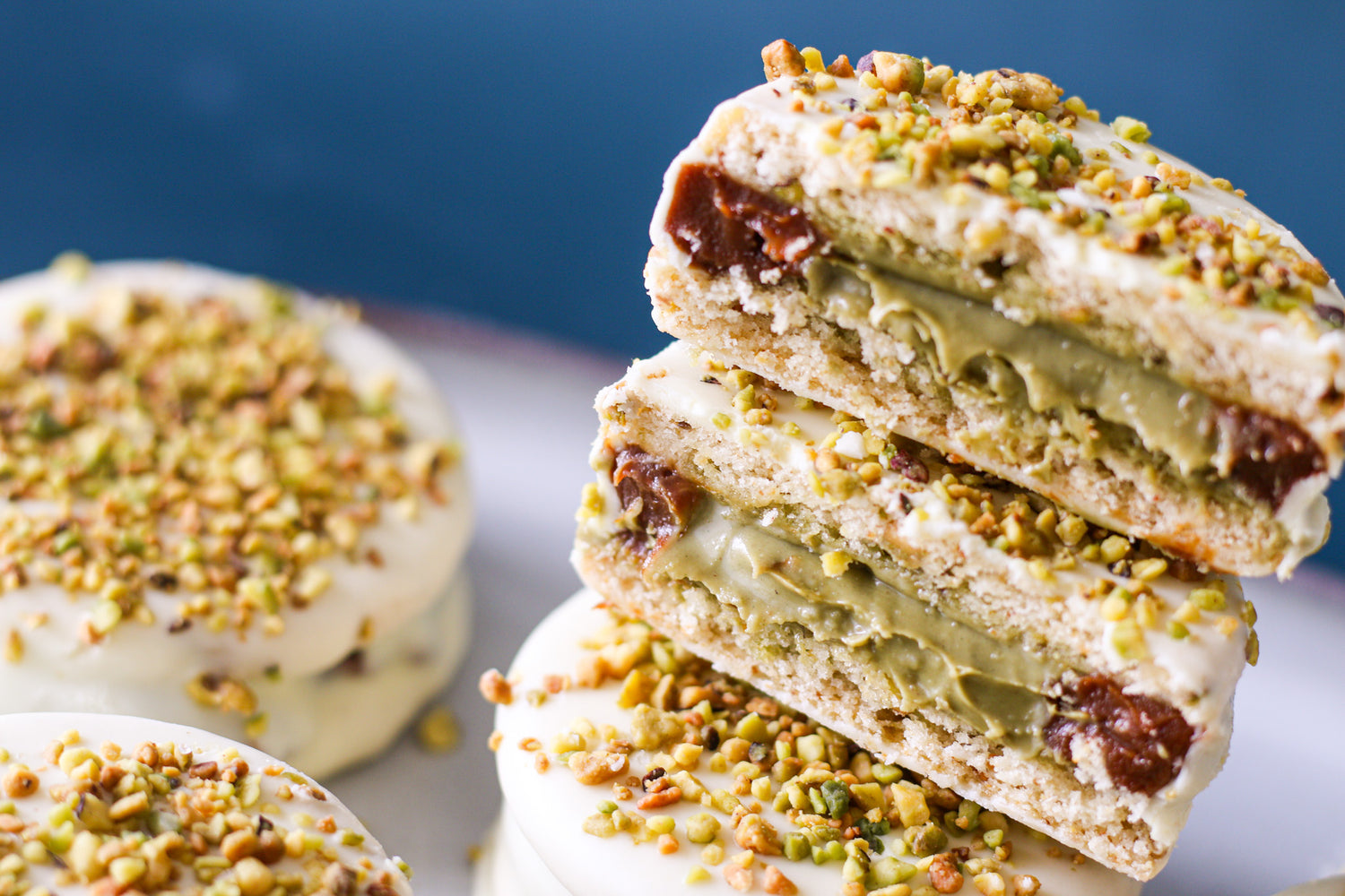 Soft pistachio cookies filled with dulce de leche and a generous center of pistachio cream and crunchy pistachio.